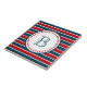 Diseño de temática náutica con decoración monográfica en forma redondeada con estrellas de fondo rayado azul, rojo y blanco