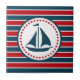 Diseño náutico con decoración de velero en forma redonda con estrellas en fondo rayado rojo, azul y blanco