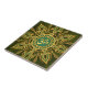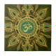 Un símbolo de Aum se sienta dentro de un diseño elaborado del sol. La estrella se compone de ocho rayos stylized que estiren hacia fuera como los rayos de un círculo en el centro. Las líneas y los puntos complejos se colorean con un amarillo de oro que se destaque para dar al modelo un brillo ligero en la superficie. Una sombra cae sobre el fondo de color verde oscuro que hace el diseño aparece flotar apenas sobre la superficie de esta teja. Este diseño elegante es una representación llamativa de este símbolo espiritual.