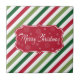 Feliz ilustracion navideño con texto y diseño de copos de nieve sobre fondo rayado rojo, blanco y verde
