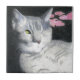 Esta baldosa está adornada con un lápiz y un dibujo en tonos pastel de un adorable gato gris de un ojo.