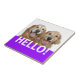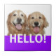 ¡Diga hola! ¡Esta baldosa cerámica ofrece una fotografía de dos perros sonrientes del golden retriever, con la palabra HOLA! en púrpura.