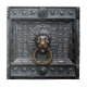 Un magnífico león de bronce en una puerta de acero forjado y antigua.