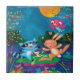 Artista: Elisa Chavarri | Racoon y conejito, rana y búho bailando en el estanque por la noche con una gran luna de otoño sobre ellos en el cielo