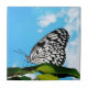 Foto de cerca de una hermosa mariposa manchada en blanco y negro sobre una hoja con un cielo azul y fondo de nube blanca.