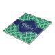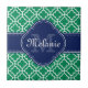Patrón de entramado marroquí verde esmeralda y blanco con un primer monograma de marina. Encima del patrón de enlistamiento verde y blanco se encuentra una etiqueta azul marino y blanca que incluye una letra monográfica y una plantilla de nombre para el personalizar.
