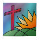Un diseño de vidrieras que ilustra la mañana de Pascua, con una cruz roja parada en las verdes colinas junto a un ardiente amanecer.