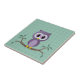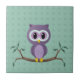 La tela cerámica blanca tiene un bonito búho personalizado púrpura en una extremidad con un fondo verde polka punto. Personalizable.