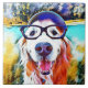 Esta teja ofrece una pintura vibrante del arte de un perro sonriente del golden retriever, que está llevando un gorra y vidrios negros del empollón.