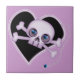 El cráneo púrpura y los huesos cruzados se colocan sobre un corazón negro con un contorno de neón púrpura y una cadena de tracción.