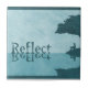 Dibujo texturizado de color verde-azul con la silueta de un hombre sentado bajo un árbol junto a un estanque contemplando. La palabra "Reflejar" descansa en la superficie del lago, el texto y las sombras reflejadas en el agua perfectamente paralizada.