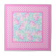 Una tela de cerámica bonito, con un patrón de rosas rosas rosas sobre un fondo azul cielo, salpicado de mariposas blancas dentro de un borde de grandes puntos blancos de Polka sobre rosa brillante. Añade un marco de madera para hacer un trívet útil y decorativo.
