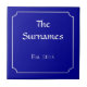Estandado por carteles en las calles francesas y números de direcciones. Borde blanco estrecho con filetes de círculo inverso en las esquinas. Fondo azul oscuro. Baldosas de cerámica. Personalizar con su apellido. Se pueden agregar nombres o se puede hacer otra personalización si se desea.