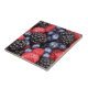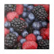 Fotografía de frambuesas de verano coloridas, moras negras y arándanos estampados en los bordes de las baldosas.