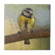 Un diseño de un bluetit azul, amarillo, blanco y negro en una rama con un fondo azul y amarillo en colores pastel.