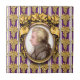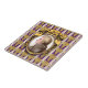 El ilustracion original de ZoeSPEAK en este pequeño mosaico cerámico presenta un retrato del compositor de música clásica Wolfgang Amadeus Mozart. El retrato es un perfil enmarcado en un marco dorado oval ornamentado. El marco cuelga sobre un fondo de papel pintado de color púrpura con racimos dorados de uvas en filas y rayas verticales blancas y lavanda.