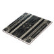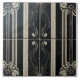 Baldosas cerámicas de estilo Art Déco con cuatro baldosas negras y blancas con motivos florales y geométricos, dispuestas en un cuadrado, diseño simétrico, flanqueado por líneas blancas verticales de diferente espesor y elementos florales, estilo vintage, decorativo, elegante y minimalista.