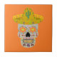 Esta impresionante baldosa presenta una imagen de diseño gráfico de un cráneo inspirado en el Día de los Muertos de México. El cráneo es de color gris pálido y lleva un sombrero amarillo. Tiene dientes de oro y girasoles mexicanos, también llamados Tithonias< en lugar de ojos. El sombrero tiene un cactus encima y está cubierto por motivos de remolinos de bonito y pimientos de chile rojos y verdes. El cráneo está cubierto de flores de color bonito de diferentes tipos.