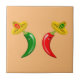 Esta impresionante baldosa tiene un par de ají, un chile rojo y un chile verde. Ambos tienen ojos negros y bocas rosas. Cada chile lleva un gorra con sombrero que tiene un cráneo de color opuesto al ají en celebración del Día de los Muertos en México, Día de los Muertos. El sombrero también contiene tres flores con pétalos rojos y verdes alternados que representan la bandera de México.