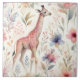 Una jirafa bellamente ilustrada se alza en medio de un vibrante fondo floral. El diseño de las acuarelas audaces y vívidas combina flores y vegetación, creando un ambiente encantador, perfecto para la decoración interior o para los temas artísticos.