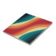 Olas de estilo retro multicolor ilustracion de patrón geométrico con rayas onduladas naranjas, rojas, beige, azules y turquesas en fondo azul oscuro