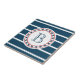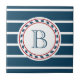 Diseño de temática náutica con decoración monográfica en forma redonda sobre fondo rayado azul y blanco