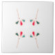 Esta baldosa cuenta con cuatro flores de tres pétalos de color rojo, turquesa, verde y delineada en naranja frente al otro hacia el centro sobre una superficie blanca plana.