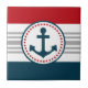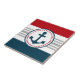 Diseño náutico con decoración de ancla en forma redonda sobre fondo rayado azul, rojo, gris y blanco