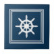 Diseño de temática náutica con decoración de ruedas de vela en cuadrados rayados sobre fondo azul