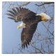 Un hermoso águila calva extiende sus alas hacia adelante justo después de saltar de su percha en una rama de árbol.
