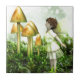 Un curioso joven hada examina un grupo de taburetes amarillos en un banco de mossy en esta original obra de arte de fantasía, creada en DAZ 3D por el artista Jayne Wilson.