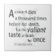 La sabiduría eterna de Julio César de William Shakespeare cobra vida en esta poderosa cita: "Un cobarde muere mil veces antes de su muerte, pero el valiente sabor de la muerte pero una vez. Me parece muy extraño que los hombres teman, viendo que la muerte, un fin necesario, llegará cuando llegue." Estas palabras de coraje han inspirado a innumerables soldados, equipos y aventureros a dar pasos audaces hacia adelante. Nos recuerdan que la victoria no se puede lograr sin valentía y que vivir con miedo sólo conduce a mil pequeñas derrotas. Este mensaje resuena más allá de su contexto original, haciendo eco de las enseñanzas de Jesús: "Quien ama su vida lo pierde, y quien odia su vida en este mundo lo conservará para la vida eterna". El verdadero valor significa valorar lo que es correcto por encima del confort personal, y encontrar la fuerza para actuar de manera desinteresada y audaz frente al miedo. Ya sea como inspiración para uno mismo o como estímulo para alguien que le importa, que esta cita sirva como recordatorio de vivir valientemente, elija valentía antes que miedo, y acepte las mayores recompensas que surgen de hacer lo que es correcto.