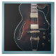 photography closeup of an electric guitar in warm brown wood colors on a black background.