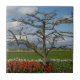 Los tulipanes florecen por debajo un árbol frutal listo para florecer con las colinas de la cascada en el fondo, las nubes hinchadas blancas, y un campo de narcisos amarillos en flor completa. Fotografiado en el valle de Skagit durante el festival anual del tulipán en Mount Vernon, Washington.