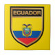 La bandera nacional de Ecuador está infundida en una falsa forma de escudo dorado con el nombre del país agregado encima de la bandera.