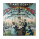 Circa 1885 - Publicidad para Ale jengibre con globo y canasta con asistentes negros. Dos mujeres beben Excelsior Ginger Ale, insinuando que el carbonato ayuda a que el globo se eleve. Imagen de dos mujeres vestidas a la moda con trajes largos y delgados y bonnets embarcándose en un paseo en globo aerostático, una se para dentro de la canasta sosteniendo un pañuelo de borde de encaje con un operador de globo con bigotes con binoculares y un monóculo, y la otra sopla jengibre de un vaso cuando empieza a subir una escalera de cuerda al avión; dos hombres afroamericanos con botellas de jengibre globo; una gran multitud observa el espectáculo desde las gradas detrás de una valla de madera blanca pintada con lemas publicitarios