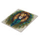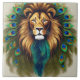 Una cara sobre la cabeza de león rodeada de plumas de pavo real como extensión de su hombre.
