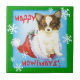 Celebra la temporada navideña con un adorable cachorro Papillon sentado en un sombrero de Papá Noel entre copos de nieve y las palabras: ¡Feliz cumpleaños! Excelente idea de regalo de vacaciones para la familia y amigos amantes de Papillon.
