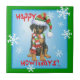 Celebra la temporada navideña con un adorable cachorro Doberman Pinscher usando un gorra lleno y una bufanda en medio de copos de nieve y las palabras: ¡Feliz Amanecer! Excelente idea de regalo de vacaciones para la familia y amigos amantes de Dobie.