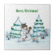 Azulejo ¡Feliz Navidad! Hombre de nieve con gato y cachorr