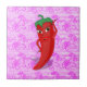 Un personaje de dibujos animados de pimiento rojo y picante. Diseño original con patrón de encaje rosa en el fondo.