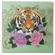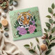 Retrato de tigre con flores rosadas y moradas claras. Henna alrededor del tigre en un fondo de verde.