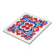 A striking red blue and white tile featuring a symmetrical floral motif framed by bold geometric shapes. At the center, a four-petal bloom anchors the design, surrounded by angular curves, teardrop accents, and mirrored heart-like forms. The high-contrast palette and rhythmic layout evoke both mid-century modern and folk-art sensibilities, creating a timeless visual emblem with sculptural clarity and ornamental depth.