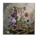This design is special for evoking a sense of forgotten beauty and enchantment. The letter 'I' features richly detailed gold Baroque scrollwork juxtaposed with a cracked antique texture, suggesting age and neglect. The surrounding deep purple and orange flowers, moss, and woody vines create a dimensional, magical, and highly personalized piece of woodland art.