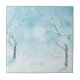 Baldosa cerámica con acuarela de invierno refinado paisaje en tonos azules. En el centro hay dos árboles cubiertos de neblina helada nevada, las ramas de los árboles crean una delgada telaraña contra el cielo y se extienden unos hacia otros en el encanto del invierno creando un idilio en los años venideros. Baldosas de cerámica tierna fresca de invierno. Colección de Frescor de Invierno.