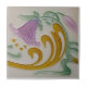 Un bonito diseño Art Nouveau lily en lila, verde y dorado sobre un cálido color blanquecino. El original es una baldosa moldeada con vidrios pintados a mano. El azulejo parece tan dimensional como el original, pero éste es realmente plano, impreso en un estilo trompe l'oeil ("tonto el ojo"). Pueden ver cómo estos azulejos se ven como un borde en la sección de medios de nuestra tienda.