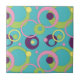 Un fondo azul brillante está adornado con un patrón diverso de círculos, puntos y anillos en una variedad de colores vibrantes, como rosa, verde, morado y amarillo. Esta baldosa puede enmarcarse para crear un trívet o colocarse dentro de una tapa de caja de regalo de madera. Los mosaicos sin marco también caben dentro de la gran caja de regalo para crear un conjunto de coincidencias.