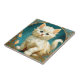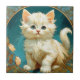 Baldosa cerámica con un gato blanco al estilo Art Nouveau de Alphonse Mucha! Un felino blanco acentuado mira fijamente al espectador contra un fondo azul. ¡Un gran regalo para los amantes del gato y de los coleccionistas Art Nouveau!