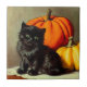 Tile cerámico con un gato negro vintage de Halloween y calabazas! Esta pequeña pelota de piel se sienta adorablemente al lado de dos calabazas naranjas. ¡Un gran regalo para los amantes de las fiestas de Halloween y los gatos!