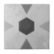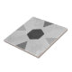 This ceramic tile features a central hexagon surrounded by four triangles, each outlined in cream for a crisp geometric design. The background is a soft swirl of grey tones, creating a soothing and artistic aesthetic. Ideal for modern bohemian or minimalist interiors.
